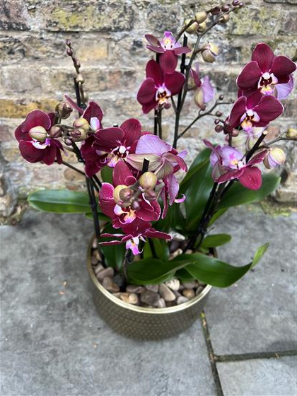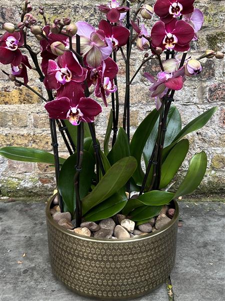 Purple Orchids in a gold planter