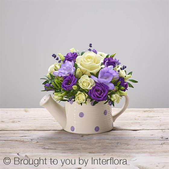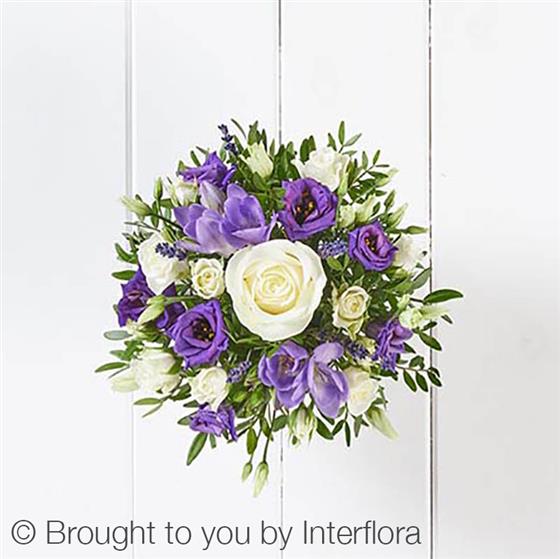 Featuring an ivory large headed rose, purple freesia, purple lisianthus, white spray roses, dried lavender and pistache, beautifully arranged in a ceramic pot.