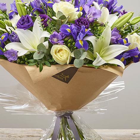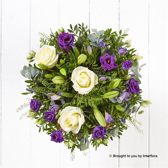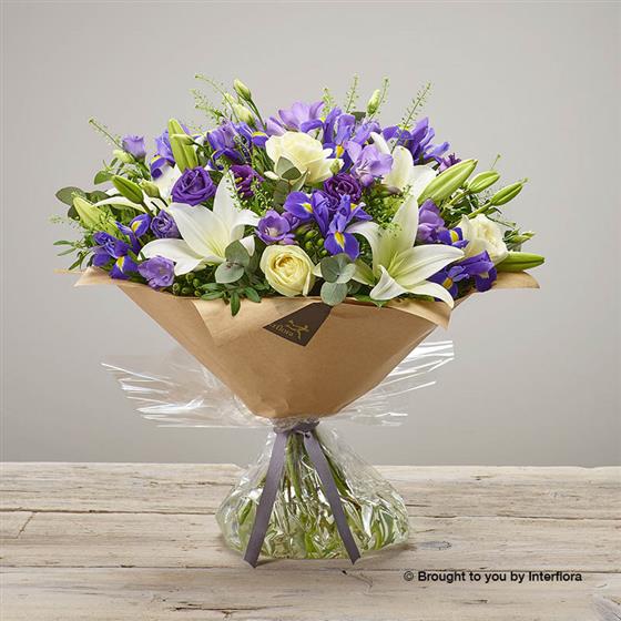 Featuring ivory large headed roses, purple freesia, blue iris, white lilies, purple lisianthus and thlaspi handtied with eucalyptus and pistache, finished with gift wrap and ribbon, presented in Interflora gift packaging.