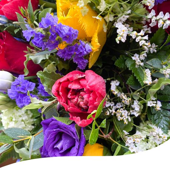 Honor the memory of a loved one with our Radiant Joy Floral Wreath. This beautiful arrangement features an exquisite mix of bright red Roses, sunny yellow Tulips, Ranunculus, deep purple Lisianthus, Statice and delicate white filler flowers, all beautifully complemented by lush green foliage. Crafted with care and respect, this wreath is perfect for expressing your heartfelt condolences and celebrating a life well-lived.