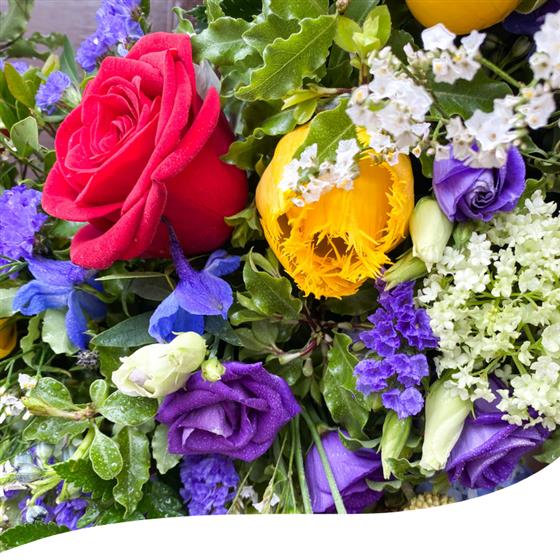 * Please note that while the image features Tulips, they are only available in the spring. However, we can create the same arrangement by replacing the Tulips with the seasonal flowers available.
