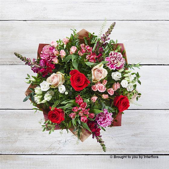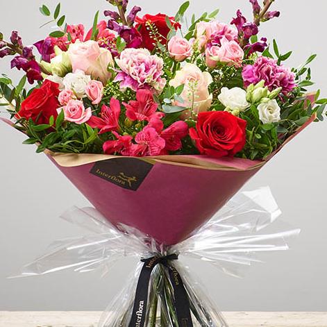 Featuring red antirrhinums, cerise alstroemeria, red and pink large headed roses, pink/cream carnations, pink spray roses and white lisianthus with thlaspi, pistache and eucalyptus, hand-tied, wrapped and presented in gift packaging. Standard Price Point Pictured.