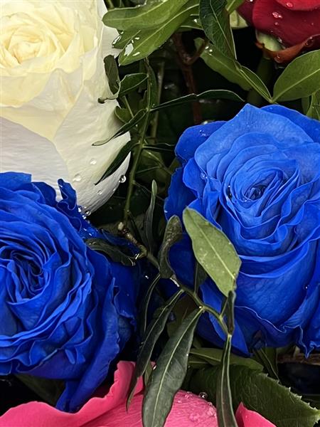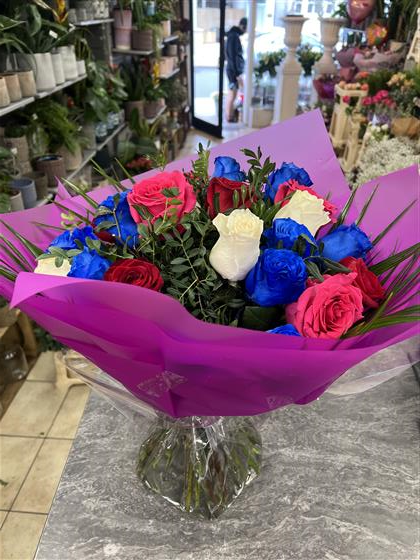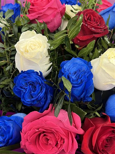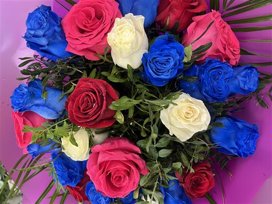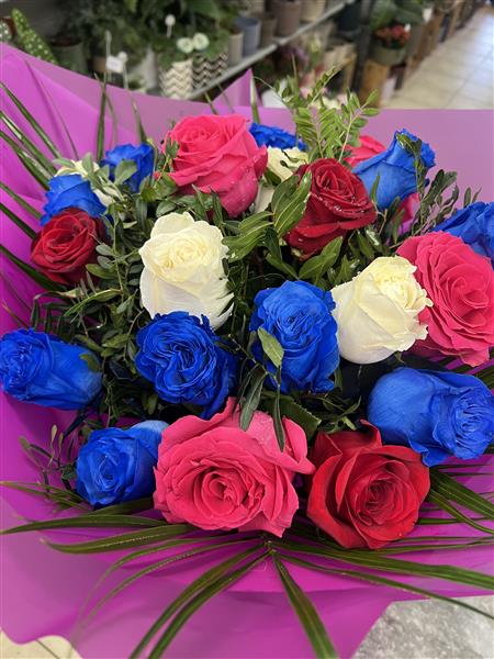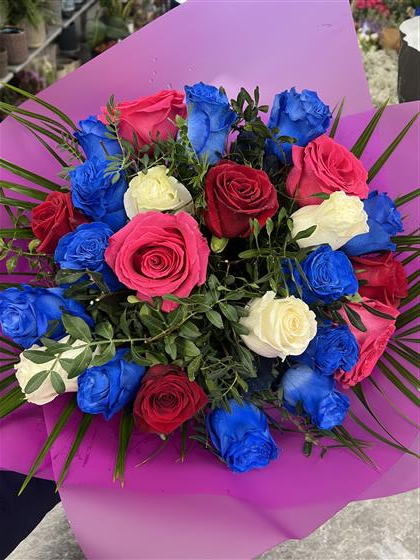 A hand tied bouquet of 24 Red, White, Pink and Blue Roses arranged into a Bouquet.