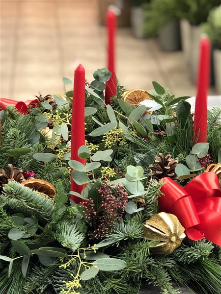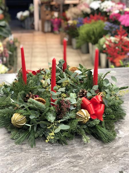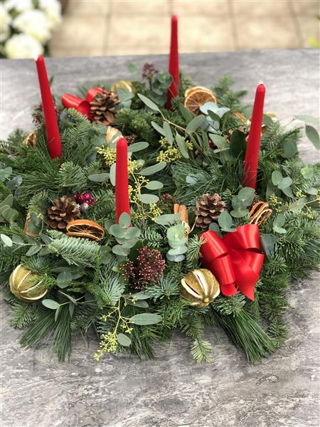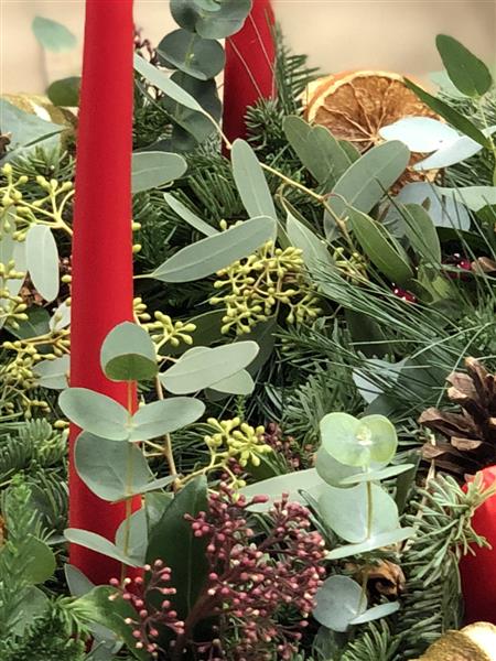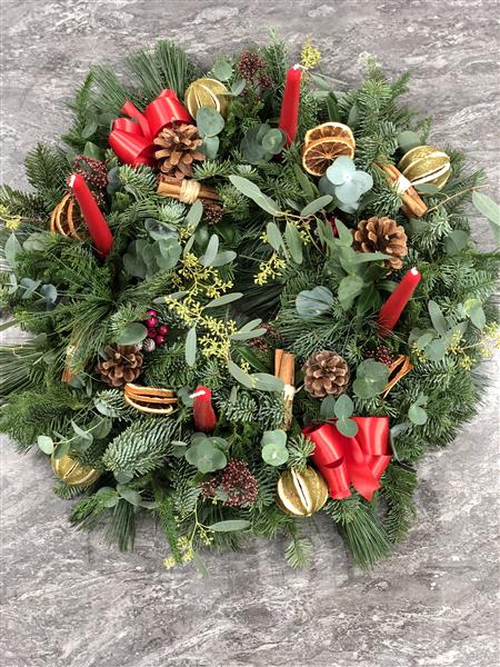 18 inch advent wreath made on a 14inch frame using beautiful mixed pines, Eucalytpus, Skimmia Berries, 4 Tall tapered Candles and a mixture of festive dried fruit and cones.