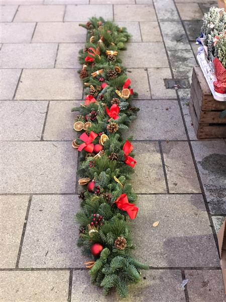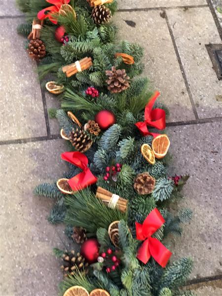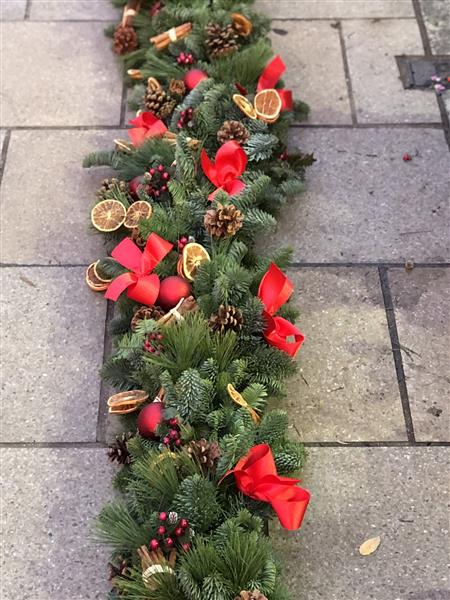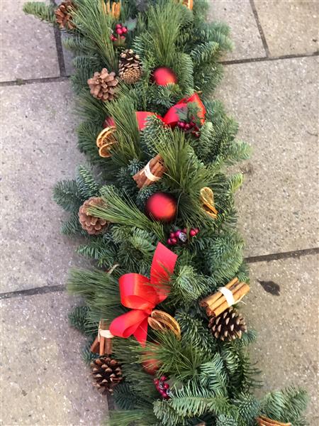 This beautiful Garland is made with 2 Pines. Blue Pine and Scott’s Pine. We add Oranges, Red Berries, Cinnamon Sticks, Pine Cones, Red Eleganza Ribbon Bows and Red Christmas Baubles.