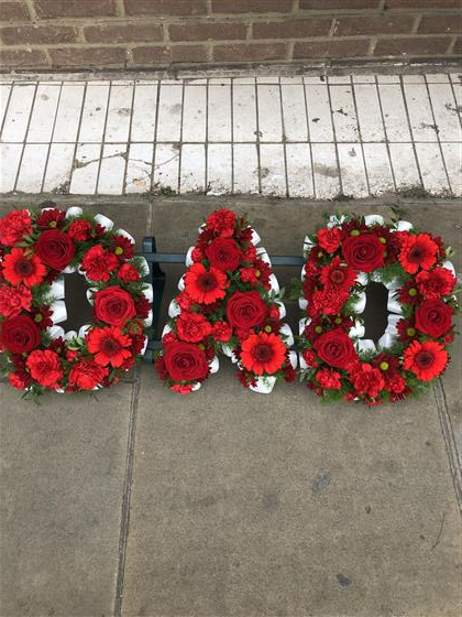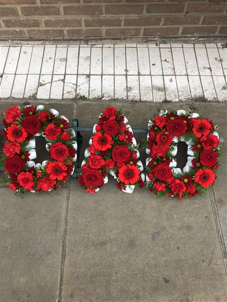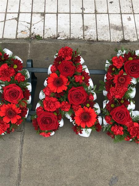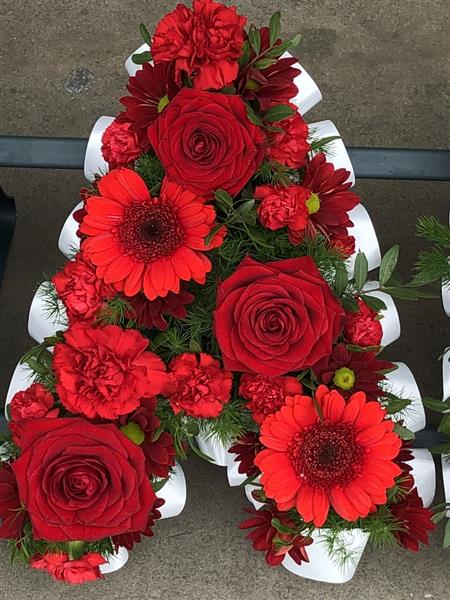 An all Red Mixed Flower DAD Tribute. Made with Red Roses, Red Gerberas, Carnations, Spray Roses, Chrysanthemums Hypericum Berries and Foliage.