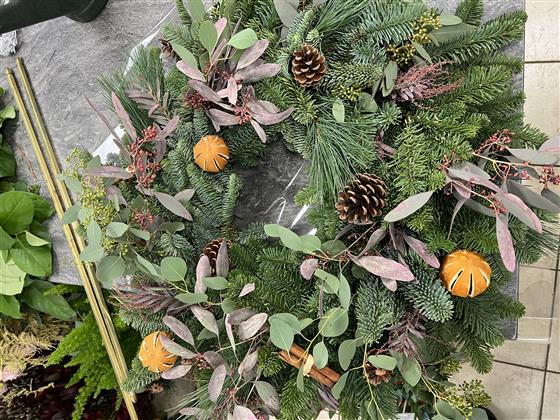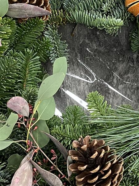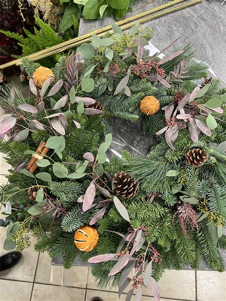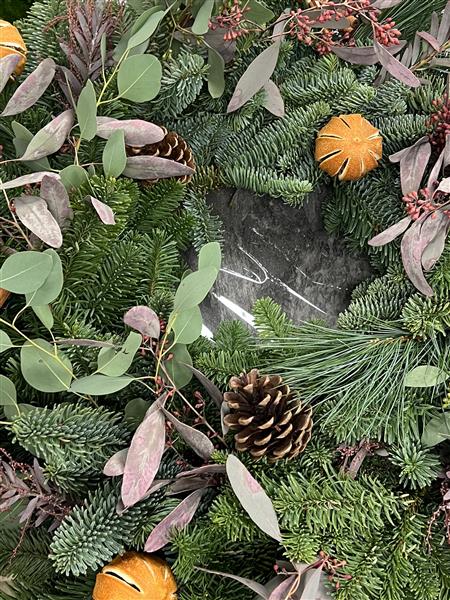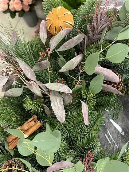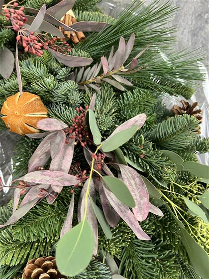 This natural looking door wreath uses red Acacia Mimosa and Red Eucalyptus. Pine cones and dried Oranges, Berried Populus Eucalyptus make this a very popular door wreath. Natural and with mixed pines on the base will last well on the door right through the Christmas season.