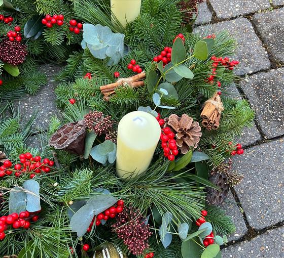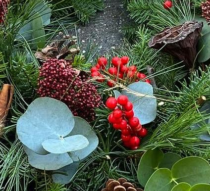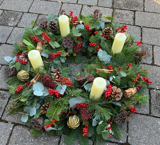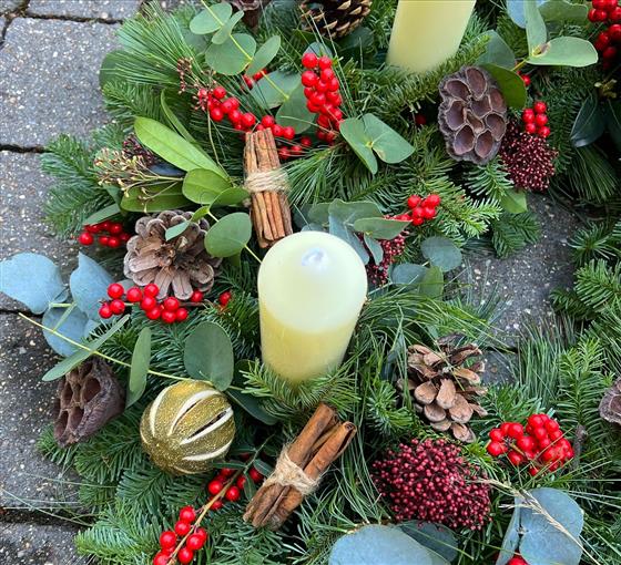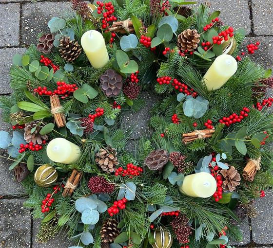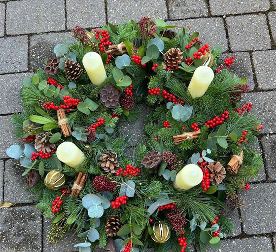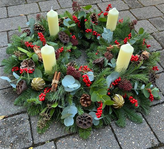 A stunning advent wreath with Red Ilex Berries, Mixed Eucalytpus, Natural decorations including Pine cones, Seed Pods, Limes, Cinnamon Twigs, With Red Skimmia and mixed Pines.