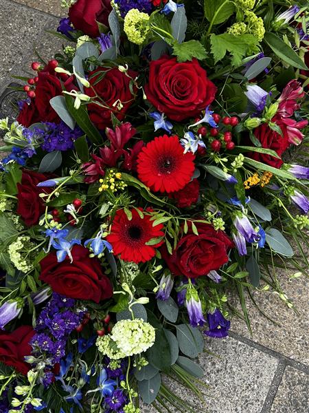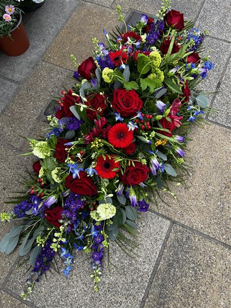 A coffin spray with red roses throughout. Additional purple and blue flowers make this a beautiful tribute.