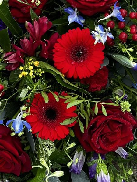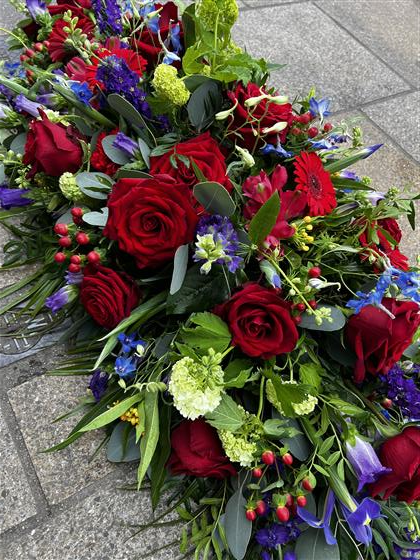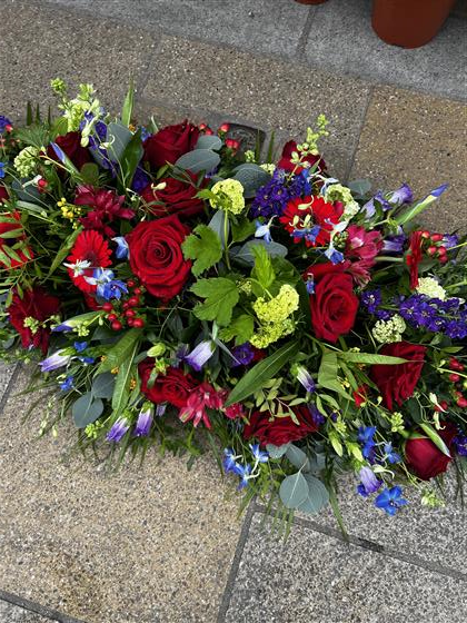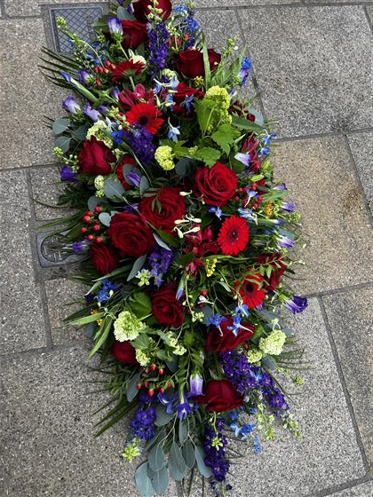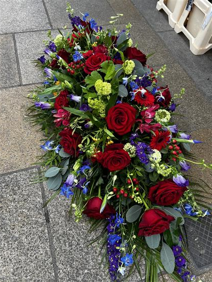 A coffin spray with red roses throughout. Additional purple and blue flowers make this a beautiful tribute.