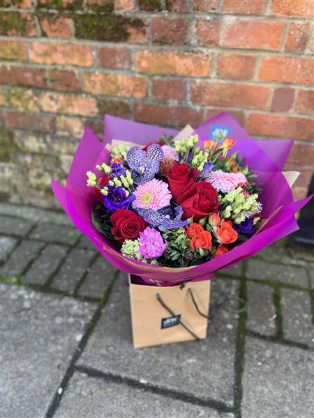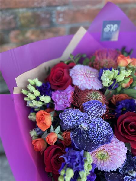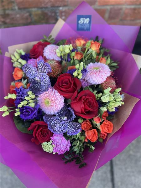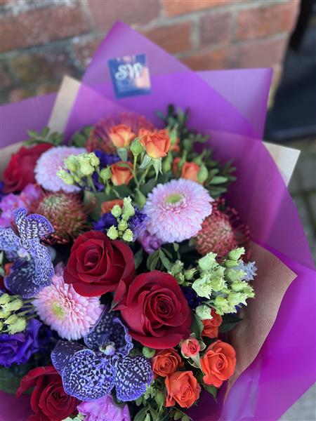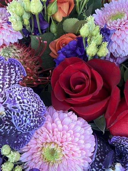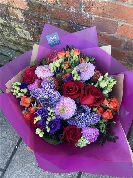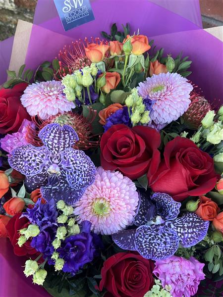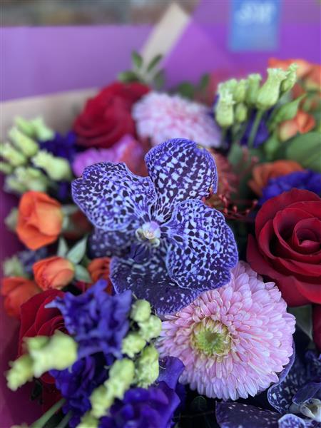 Our beautiful purple vanda orchid and red rose bouquet. Accompanied with orange spray roses, purple Lisianthus, red pincushions known as leucospurnums, fluffy pink gerberas, lilac carnations and choice foliage.