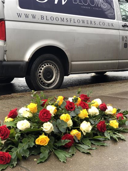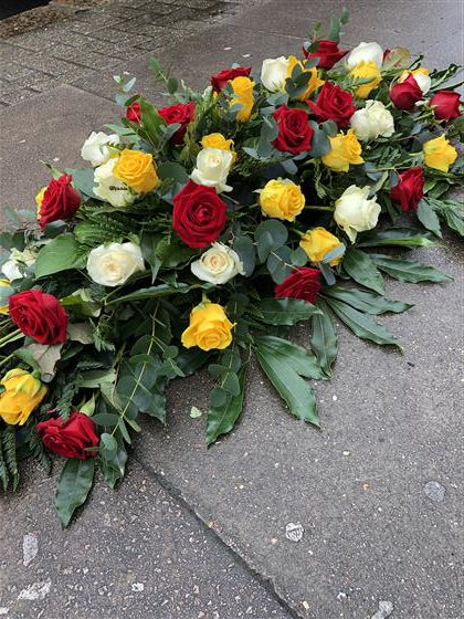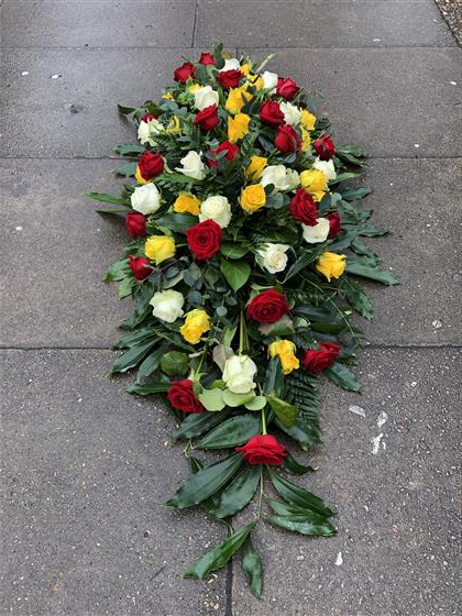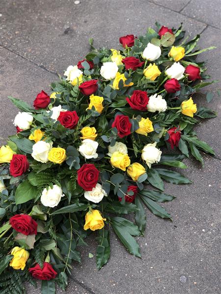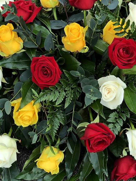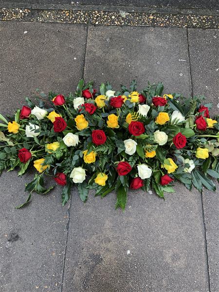 A Colourful Rose Coffin Spray using Red Naomi Roses, Yellow Penny Lane and White Avalanche Roses.