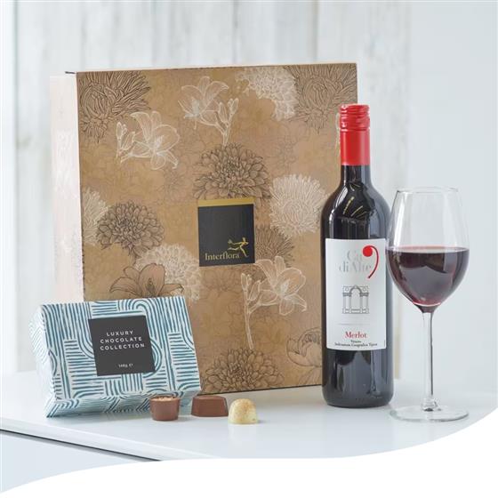 Introducing a lavish duo: a 75cl bottle of Red Orchid Merlot paired with a box of gourmet chocolates. Kindly note that while the image displays Maison Fougère chocolates, they will be substituted with our own gourmet milk chocolates filled with raspberry ganache, meticulously shaped into beautiful hearts.
