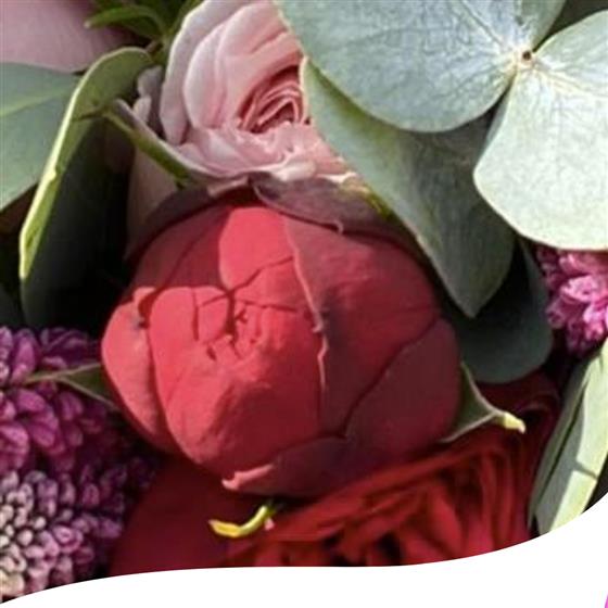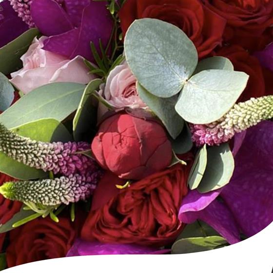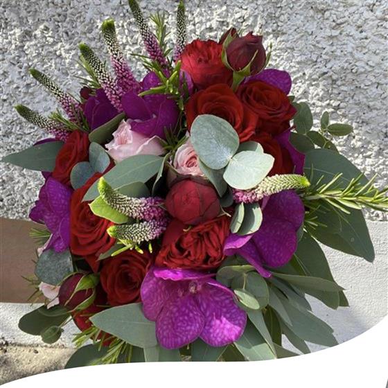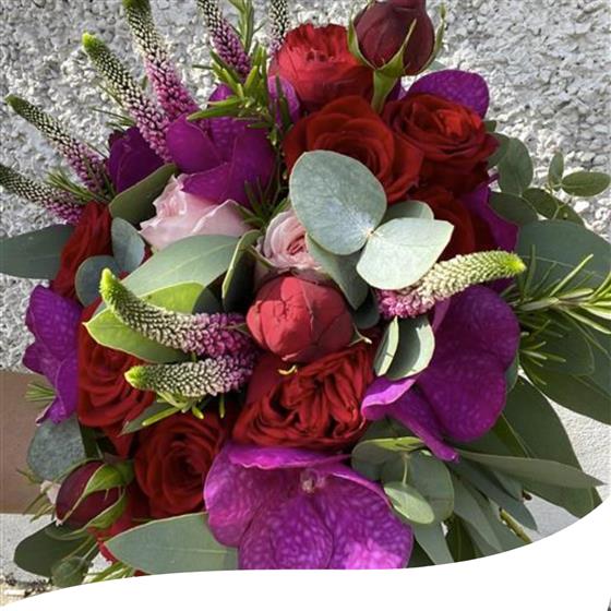 Red Garden roses, Pink David Austin garden roses, Pink Veronica’s, Cerise Phalaenopsis orchids, mixed eucalyptus and Rosemary.