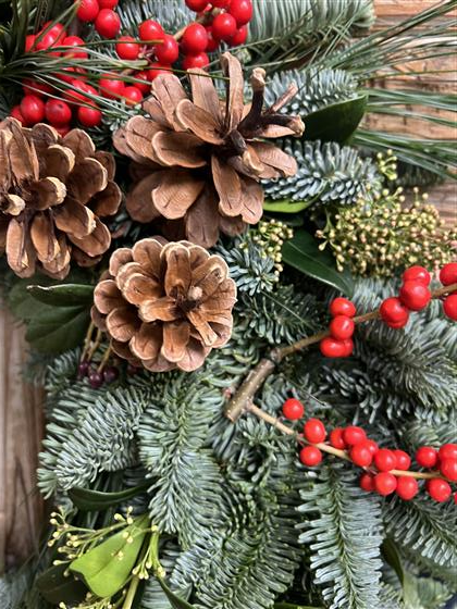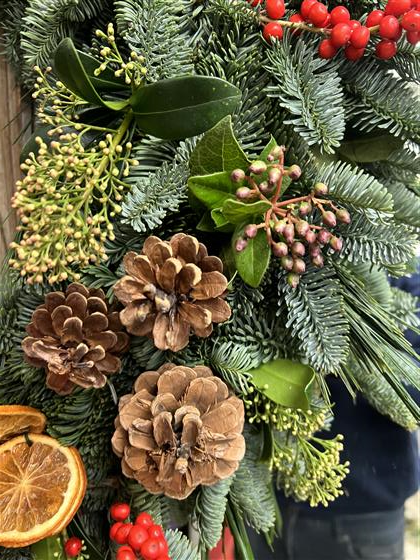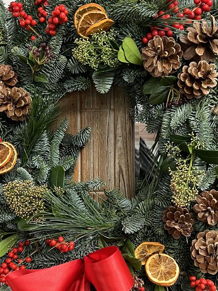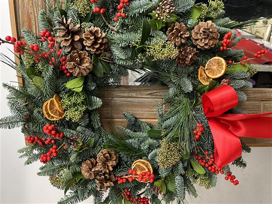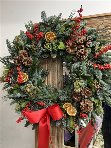 This stunning door wreath is 16 inches across and is made with Red Ilex Berry, Dried Oranges, Red Ribbon bow and beautiful Green Skimmia Berries. At SW Blooms we recommend this wreath as its made on a plastic backed wreath frame that can be refreshed with water regularly to keep tit fresh and then you can include flowers on Christmas week.
