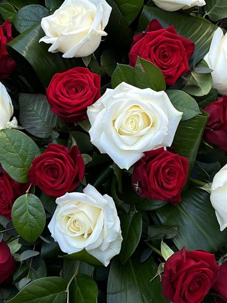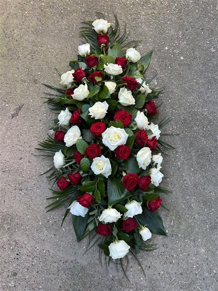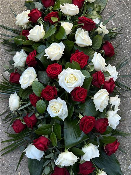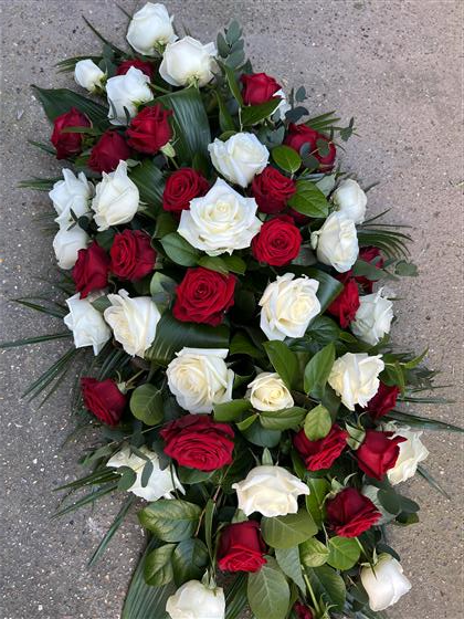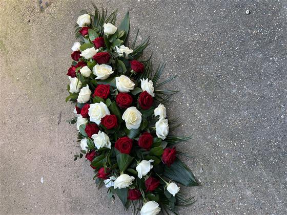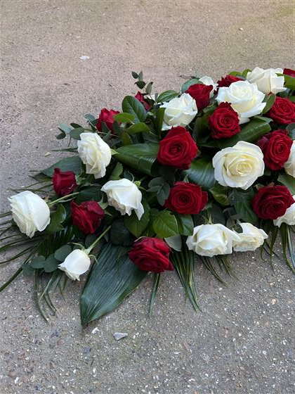 A beautiful red and white rose coffin spray on a bed of nice mixed foliage.