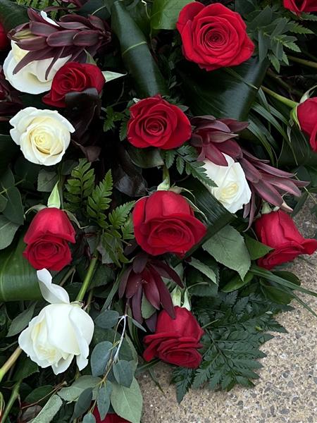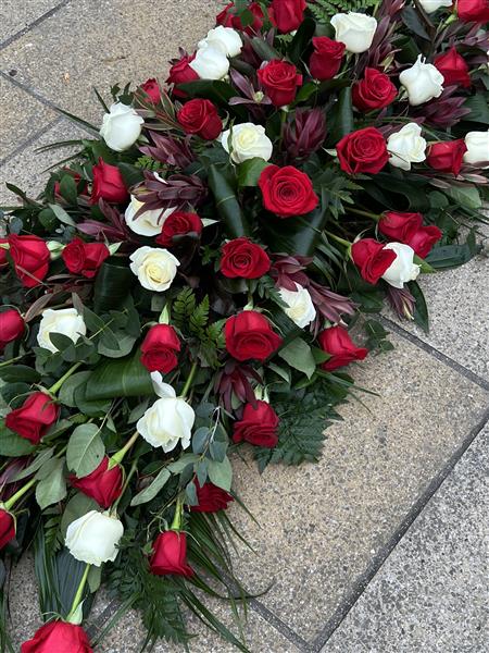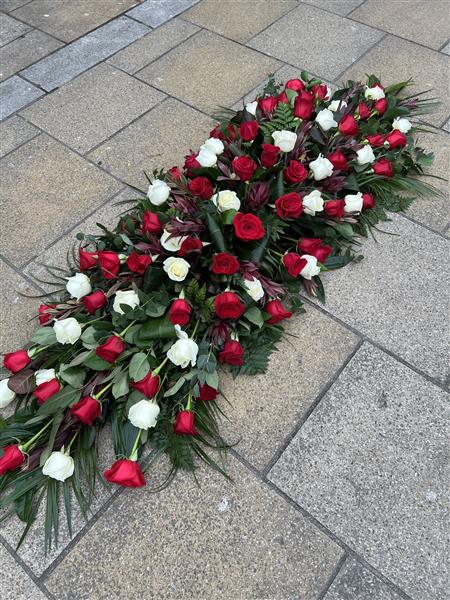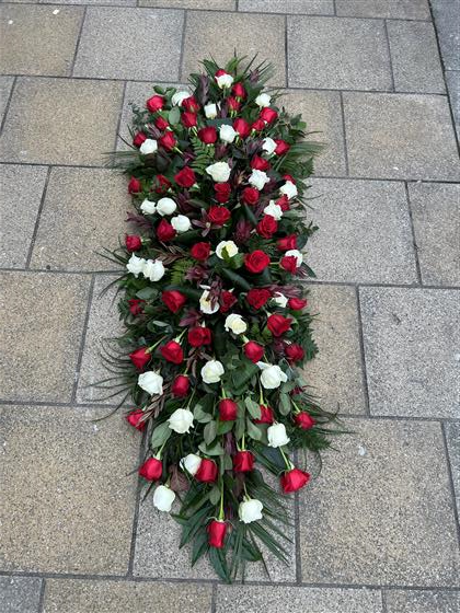 A red and white rose coffin spray. Made with beautiful foliages that blend in with the roses well. The foliage used sets off the large heads on the roses. We source the best Naomi and avalanche roses for this tribute. We will carefully check and pick over every stem and prepare it for the tribute. We will make sure the roses are open and look their best for the funeral.