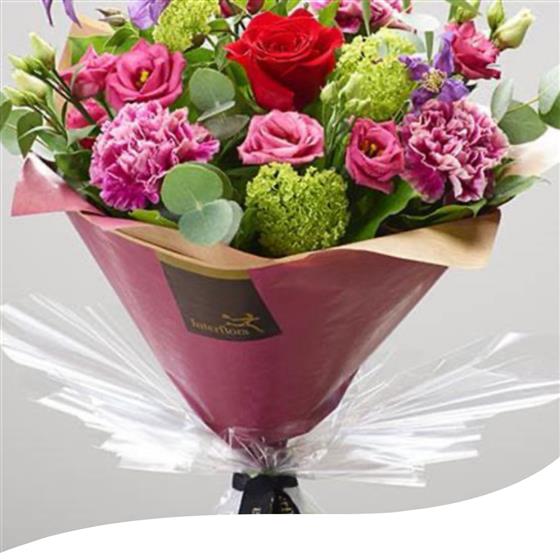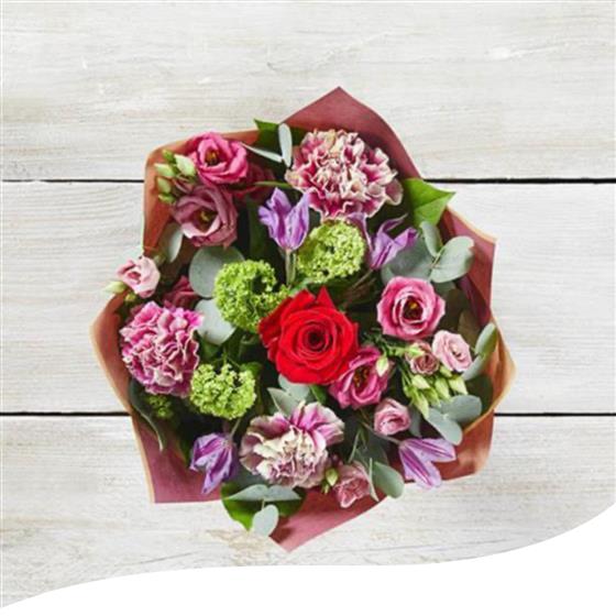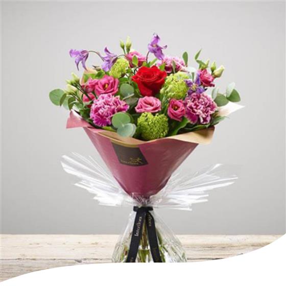 Indulge in the timeless allure of our Romantic Red, Pinks & Greens Bouquet. A Red Large-Headed Rose, Pink Lisianthus and Pink/Cream Carnations elegantly intertwine with the richness of Purple Clematis and the verdant beauty of Green Viburnum Opulus. Enhanced with Eucalyptus and Salal, this hand-tied bouquet is wrapped and presented in gift packaging.