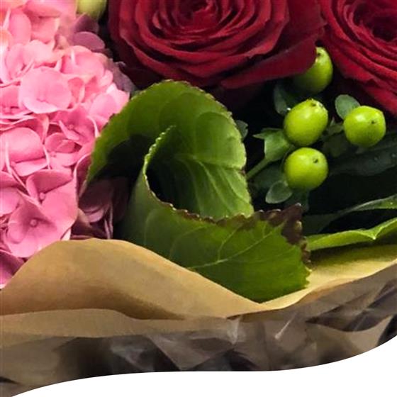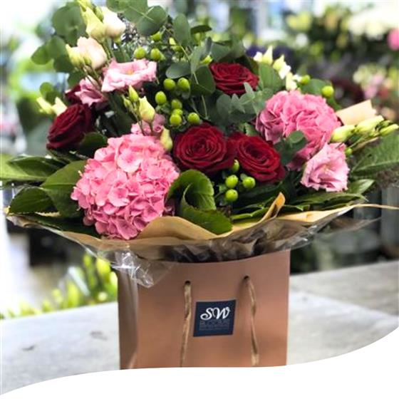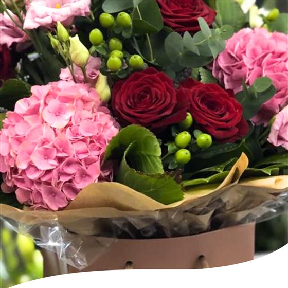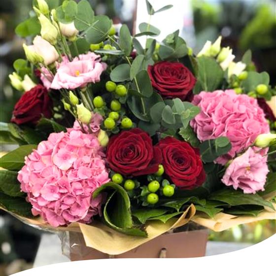 Experience the captivating beauty of our Rose and Hydrangea Bouquet, featuring a stunning blend of Red Roses, Pink Hydrangeas, Pink Lisianthus, Green Hypericum berries, and lush Eucalyptus foliage. Each bouquet is hand-tied and presented in water, elegantly showcased in a stylish gift bag, making it the perfect choice for any occasion.