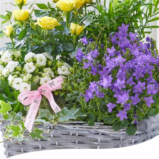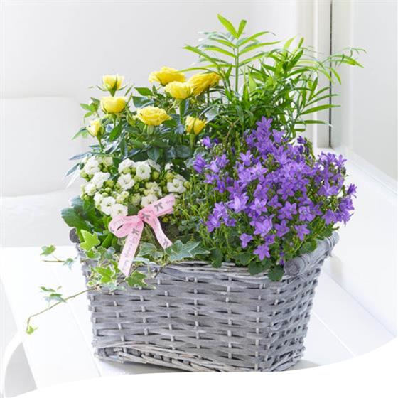Transform your space with the enchanting Rose & Kalanchoe Basket, a delightful indoor garden perfect for brightening any room for weeks. This charming arrangement includes delicate white Kalanchoe, vibrant purple Campanula, and a cheerful yellow Rose plant, all nestled in a stylish basket. The large and deluxe options feature lush Palm and Ivy, elegantly presented and finished with a pink ribbon.