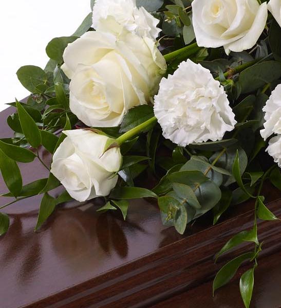 Large-headed white Rose combine with white carnations and luxurious foliages to create this traditional casket spray. Approximate height 122cm (4ft).