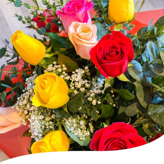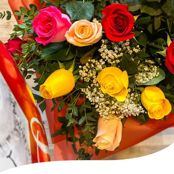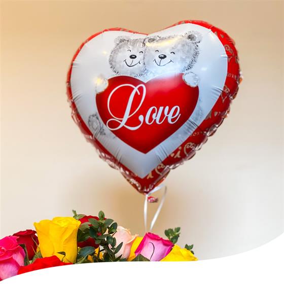 12 Long Stemmed Ecuadorean Coloured roses with all the trimmings and gyp and foliage. Arrives with a Heart Balloon attached.