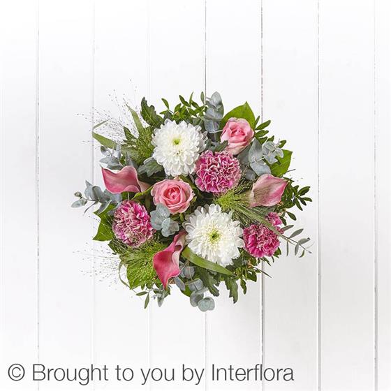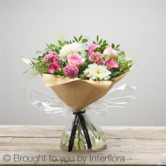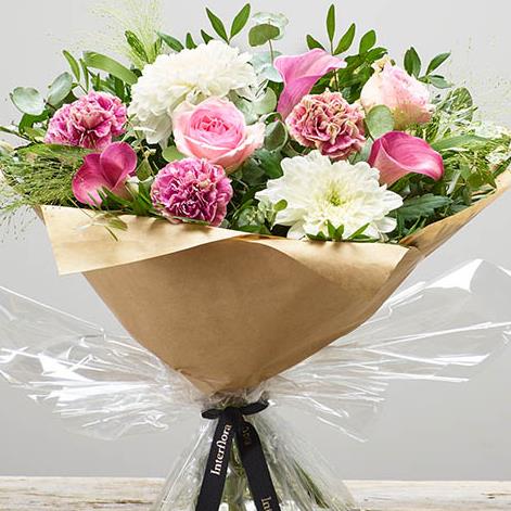 Featuring pink large headed roses, pink calla lilies, pink two tone carnations and white chrysathemum blooms, handtied with salal, eucalyptus, pistache and panicum grass, presented in gift packaging.