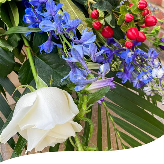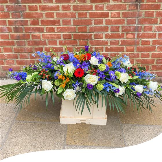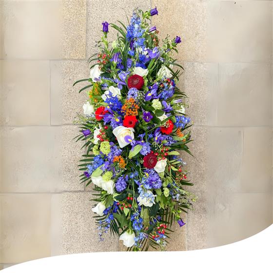 Presenting our Royal Purple Remembrance: a 5ft Coffin Spray created with meticulous care to honour and celebrate the lives of departed loved ones who will always hold a special place in our hearts. This harmonious blend of colours is a loving tribute, enhancing their memory with the elegance and beauty they brought into our lives.