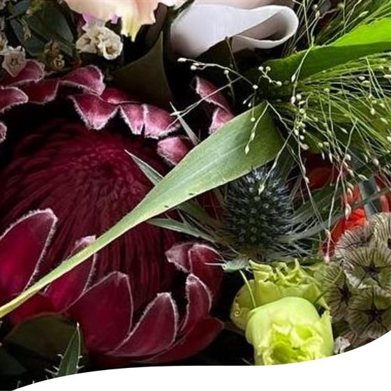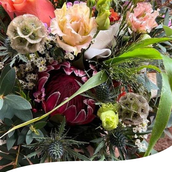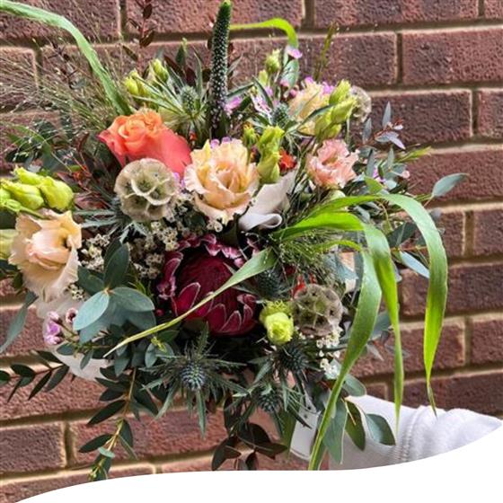 This unique bridal bouquet features a stunning blend of Protea aristata, Champagne Lisianthus, vibrant orange Roses and delicate white Veronicas. Accented with Scabiosa, Eryngium thistles, Panicum fountain grass, pink Wax flowers, white Limonium Emile, and a mix of Eucalyptus foliage, this arrangement offers a truly distinctive and elegant look.