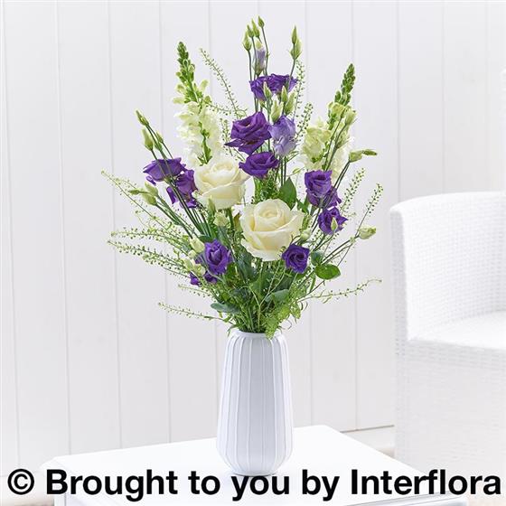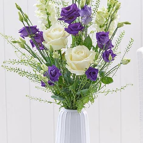 Featuring white large headed roses, white antirrhinums and purple lisianthus, arranged with thlaspi in a tall vase. White ceramic Vase is now discontinued but we will use a nice glass one instead.