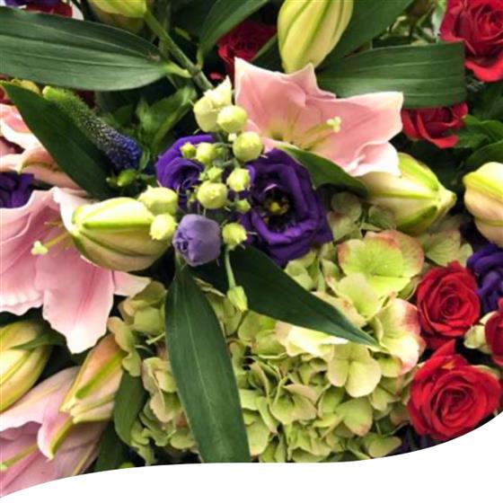 Let our skilled florists craft a stunning arrangement featuring a selection of exquisite blooms, including Lisianthus, Roses, Hydrangeas, Lilies, Veronicas, Ilex Berries, and Hypericum Berries. Each flower is meticulously chosen and expertly arranged to create a symphony of colours and textures. Experience the beauty of nature with this bespoke bouquet, tailored to your preferences. For an even more impressive display, consider upgrading to the Luxury option.