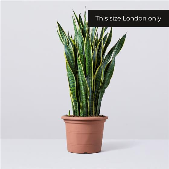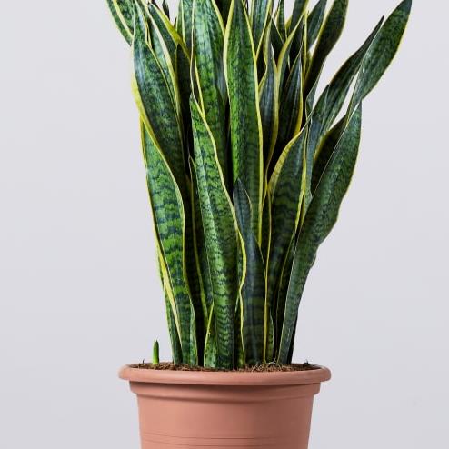 Sansevieria: Mother-in-law's tongue; Viper's bowstring hemp are just three names for this stunning plant. Low Maintenance plant which likes a lot of light doesn't need much water. Give her a drink when her soil feels dry, about every few weeks. Less in winter.