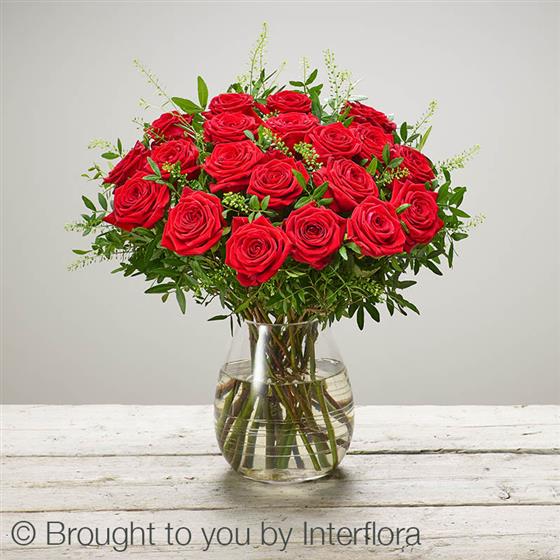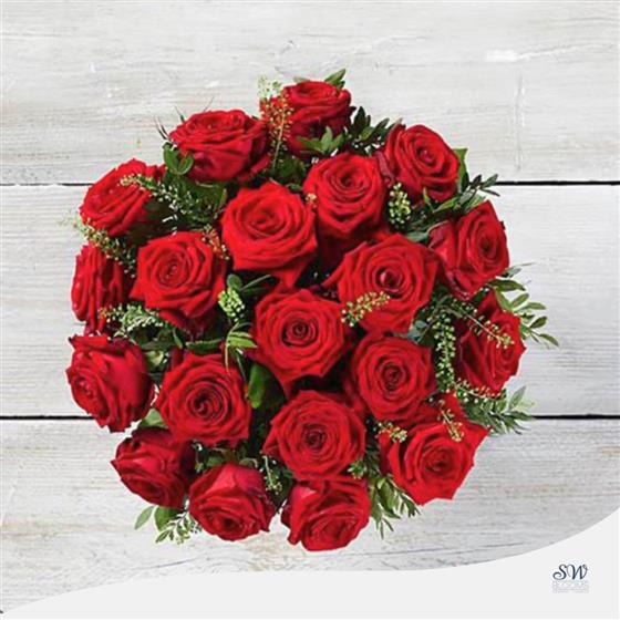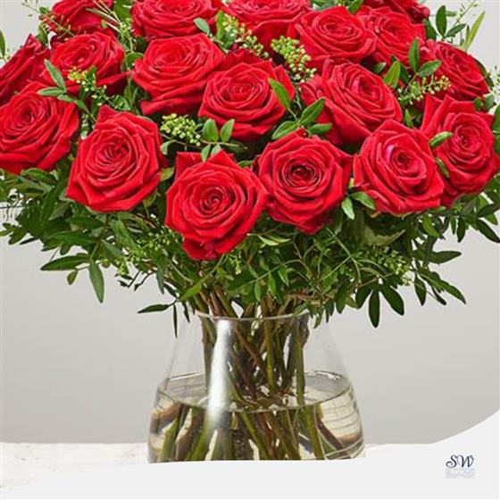 The Scarlett Surprise Vase (Large) is an eye-catching display created to enchant your emotions. This opulent collection showcases 20 Large-Headed Red Roses delicately complemented with Thlaspi and Pistache, elegantly showcased in a transparent swirled glass vase. The deep red tones and meticulously chosen foliage form a classic symbol of love and elegance. Enhance your gift-giving with this exquisite floral creation that guarantees a memorable impact.