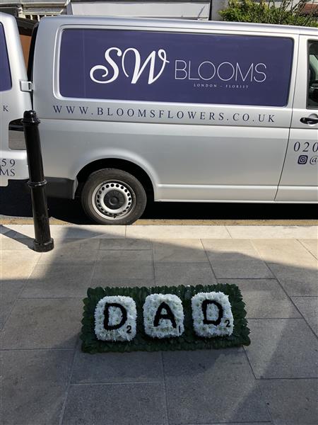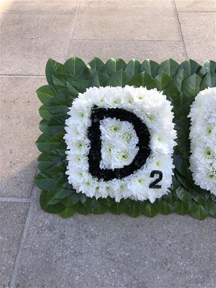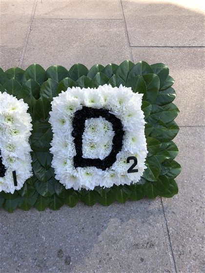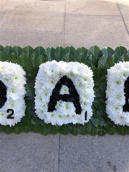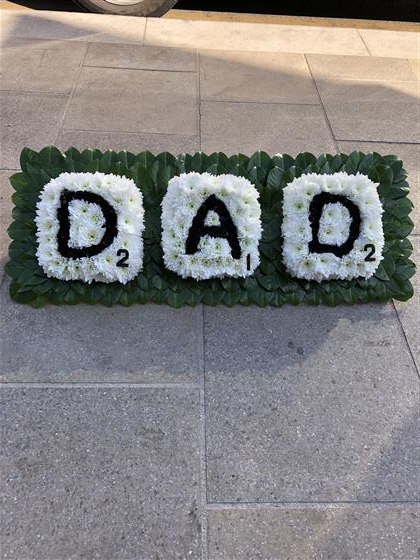 A perfect tribute for a scrabble fan. We made the tribute out of chrysanthemum flowers.