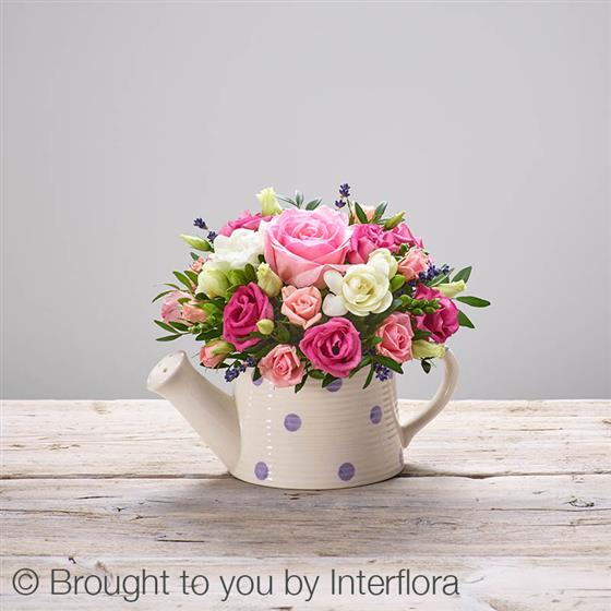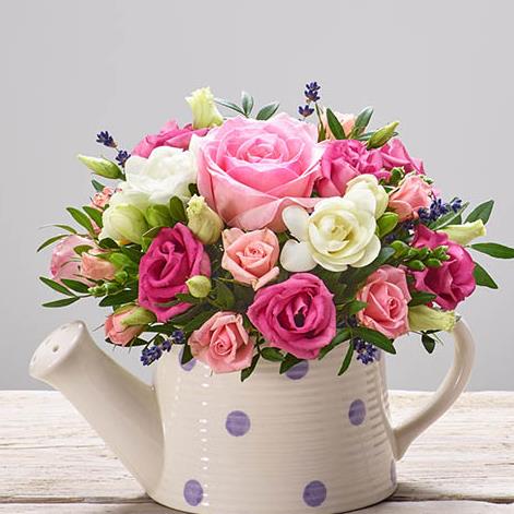 Featuring a pink large headed rose, white freesia, pink lisianthus, pink spray roses, dried lavender and pistache, beautifully arranged in a spotted ceramic watering can.