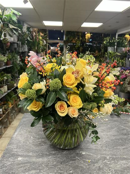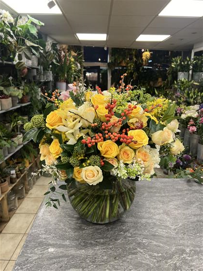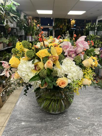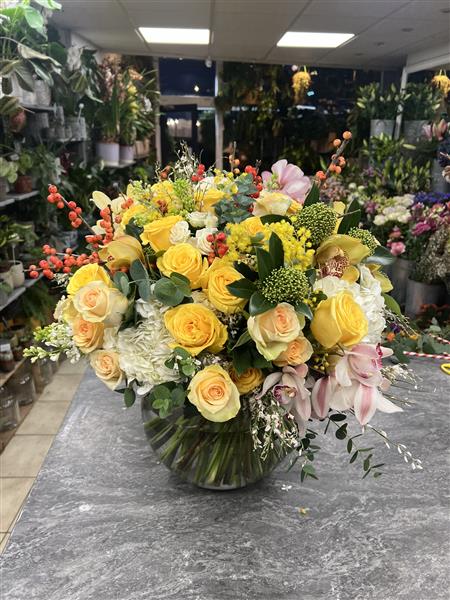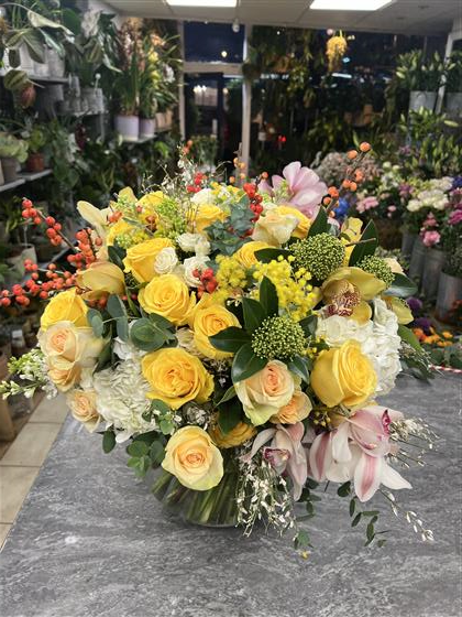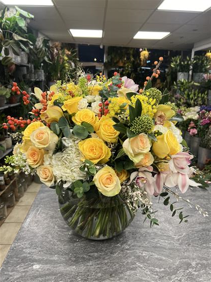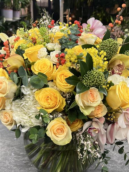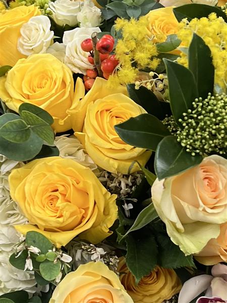 7 White and yellow stems of Cymbidium Orchids, 5 White Hydrangeas, 20 Cream buttercup garden roses, 2 Large bunches of Mimosa, a large bunch of white Ginister, 5 Large Orange Ilex Berries, mixed Eucalyptus bunches and White Syringia Lilac.