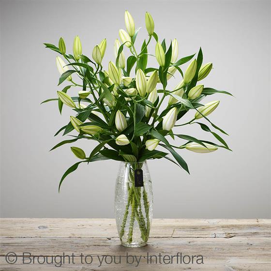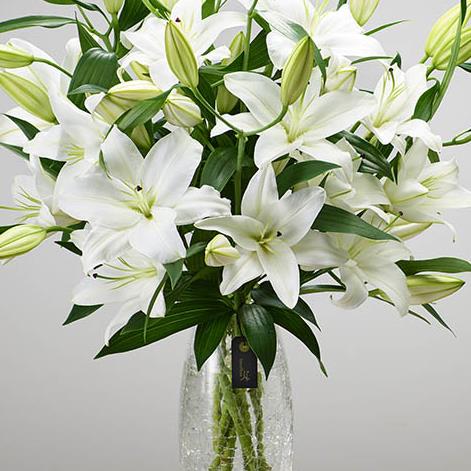 Featuring a generous selection of fresh white Oriental lilies expertly arranged in a crackle glass vase.