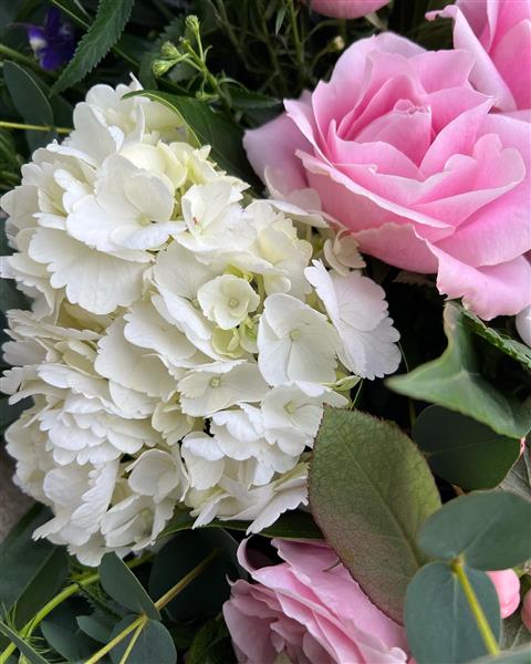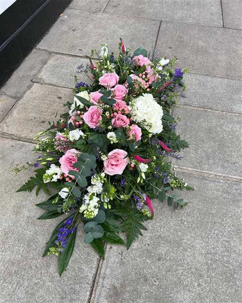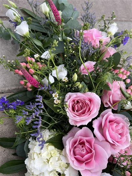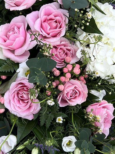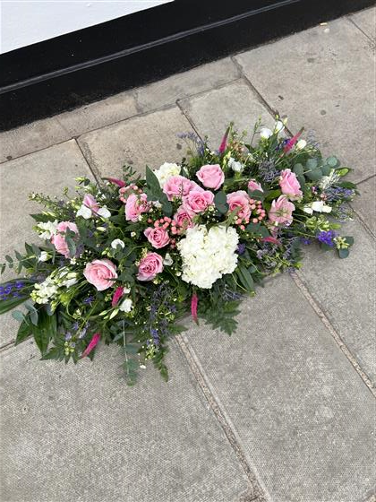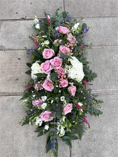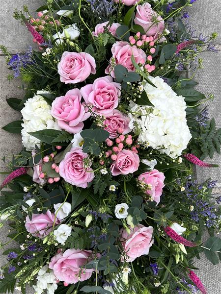 A beautiful coffin spray - soft and delicate using white Hydrangeas, Roses, Delphiomiums, Veronicas,Lisianthus and Limonium. Mixed foliage including Eucalyptus, Palms and ferns.,