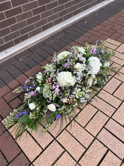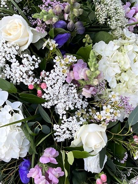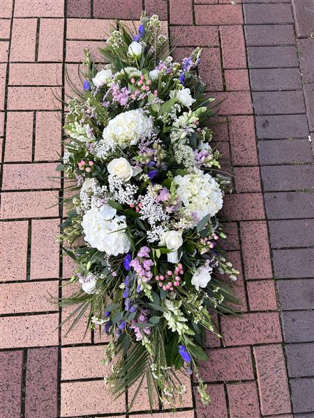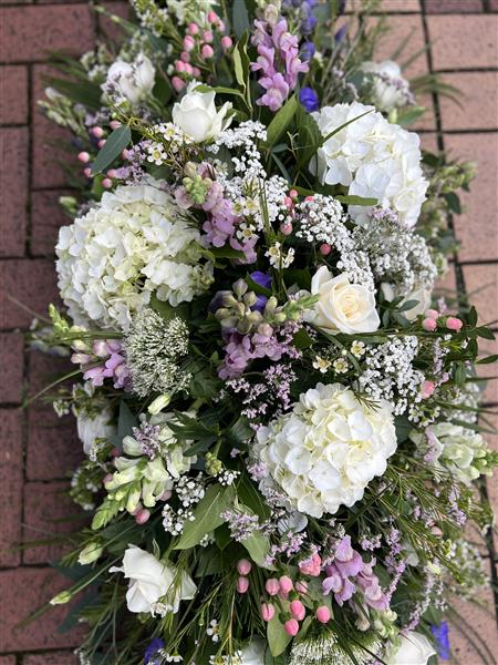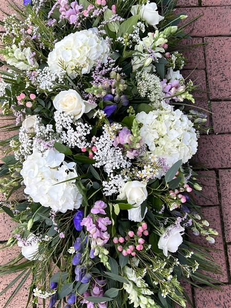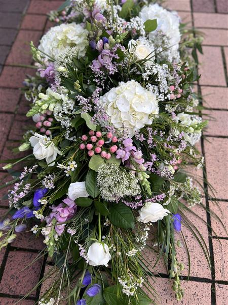 A soft garden coffin spray with wild foliage and using Hydrangeas, Roses, Veronicas, Trachelium, Berries, Gypsophila, Delphiniums and Antirinums.