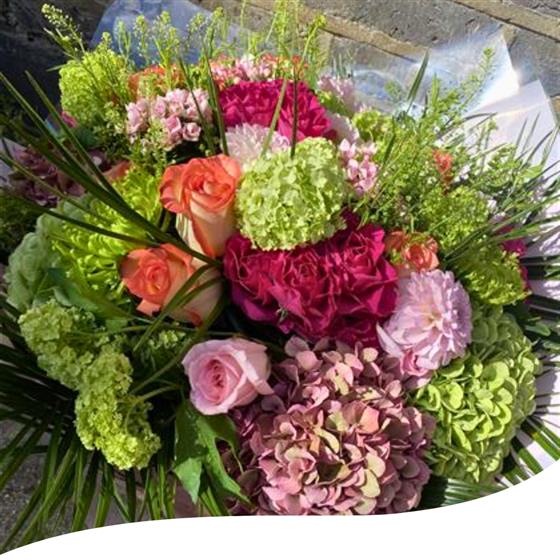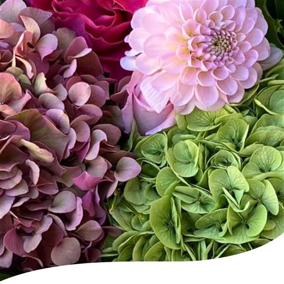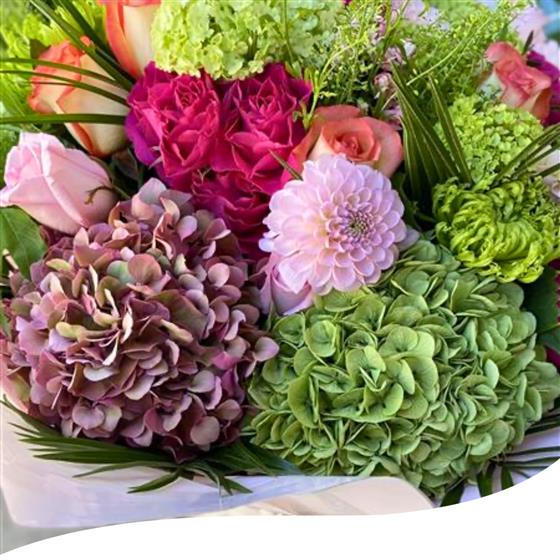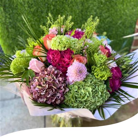 Our Sophisticated Green and Pink Bouquet (Premium) is a vibrant and elegant arrangement that adds a splash of colour and refinement to any space. This exquisite bouquet combines Pink and Orange Roses, Spray Roses, Hydrangeas, Dahlias, Bouvardia, Green Blooms, Viburnum, Thlaspi, and Palm Leaf into a stunning display.