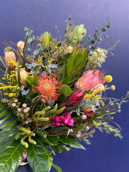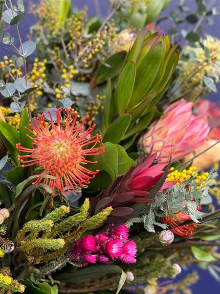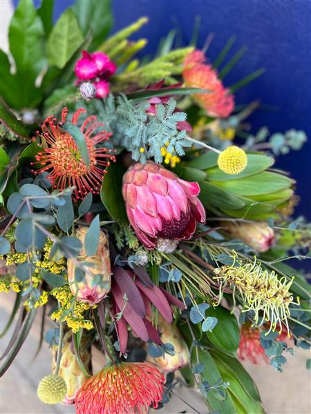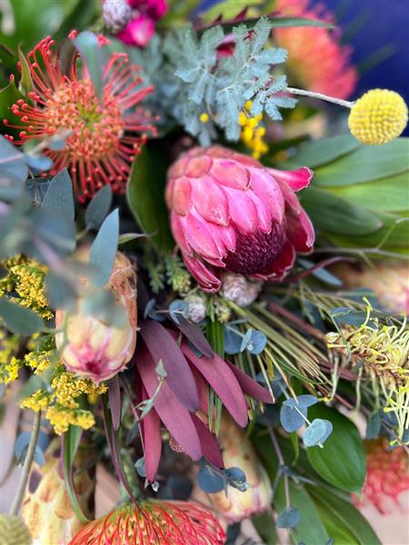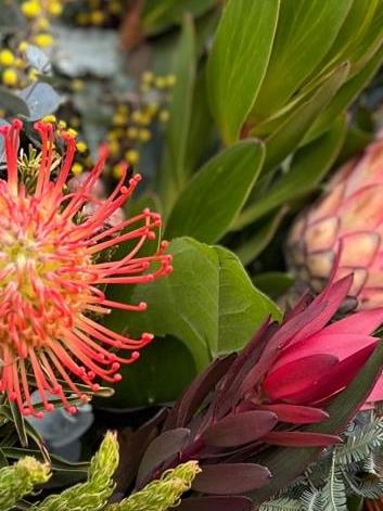 We used a selection of Proteas, Leucospurnum pincushions, Mimosa Acacia, Leucodendruns, Palm Leaves, African foliage mix with Brunias, Grevillias, Golden Rod and Craspedias.