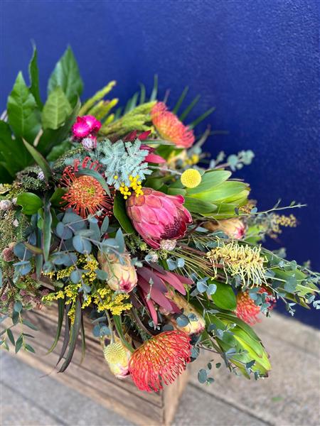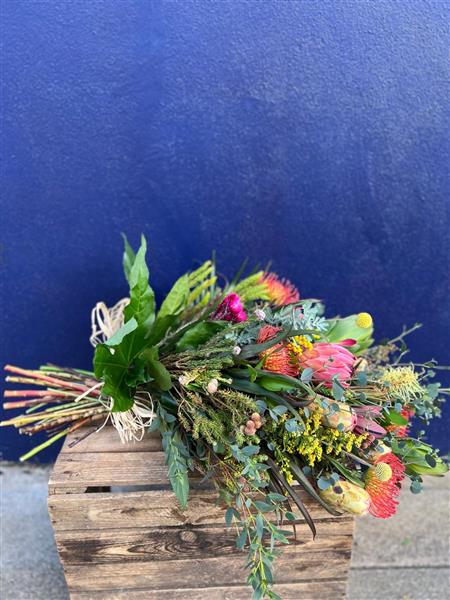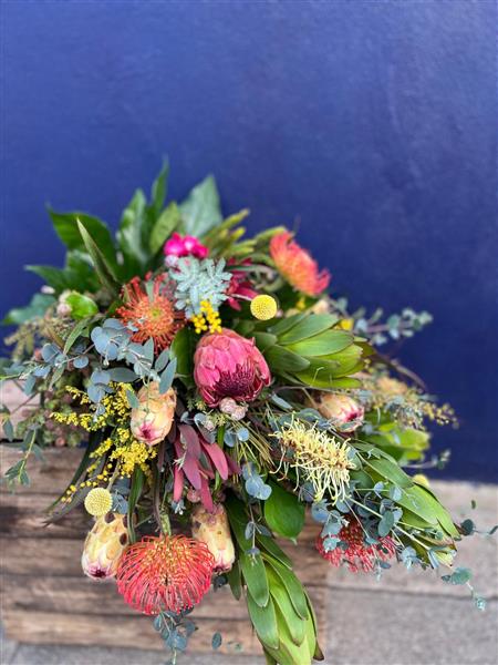 We created this beautiful sheaf of South African flowers to sit on top of the coffin.