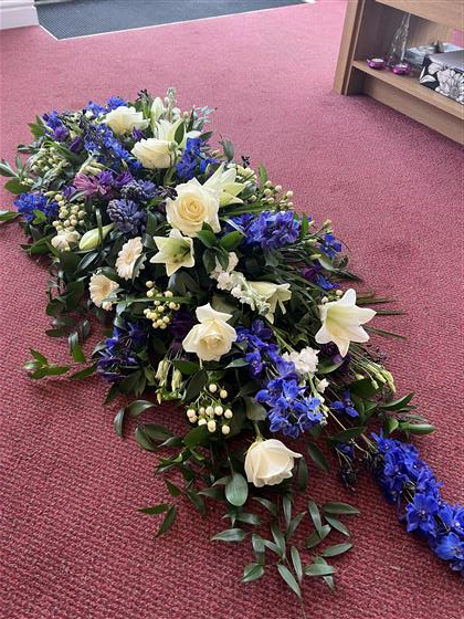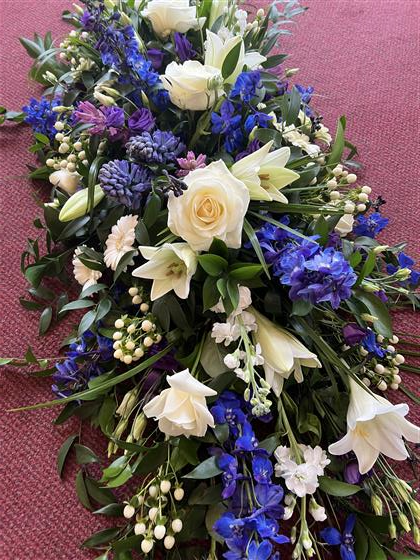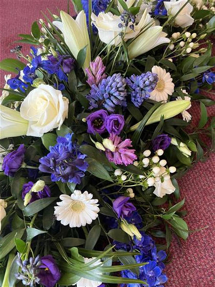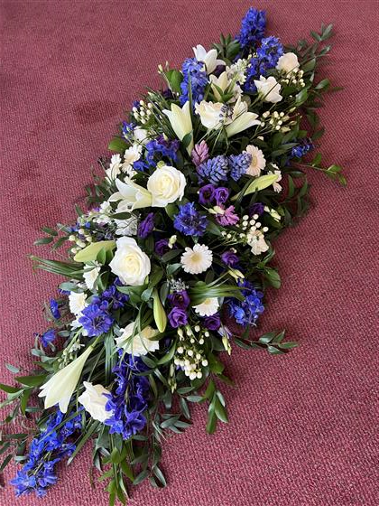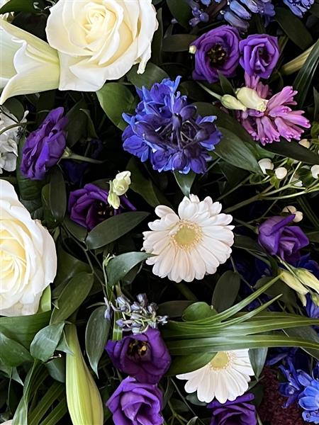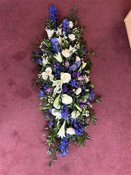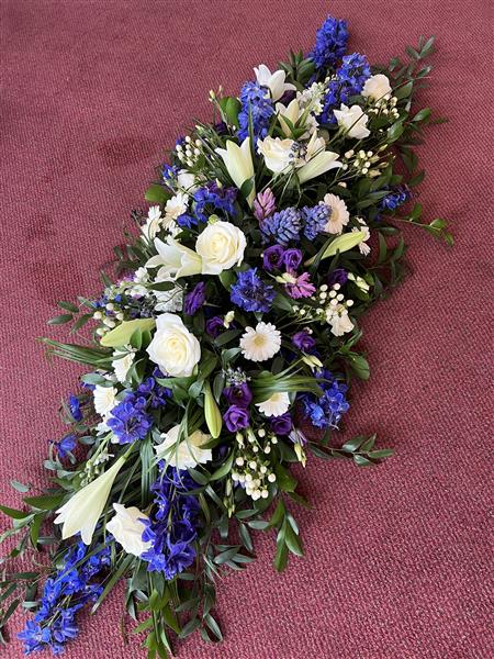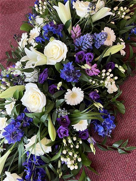 A beautiful Blue, White and Purple Spring flower coffin spray.