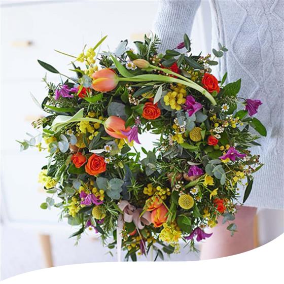 Each petal and stem is expertly arranged to create a captivating interplay of colour and texture, while carefully chosen dried flowers and grasses add a touch of rustic refinement. While your wreath may vary slightly from the image, rest assured it will be equally breathtaking.