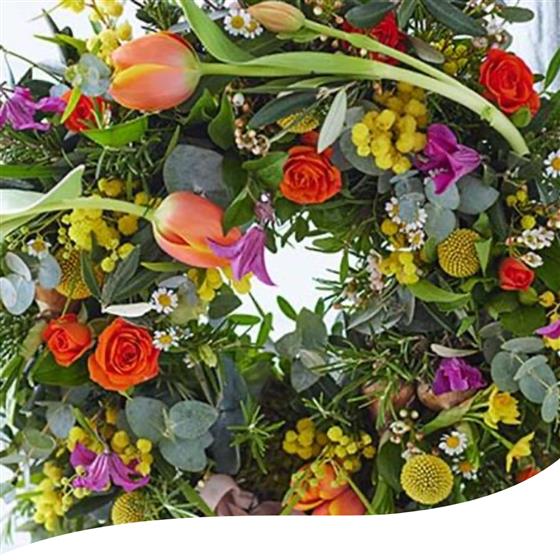 Our Spring Wreath is a modern masterpiece meticulously crafted with a harmonious blend of seasonal blooms in apricot, peach, lemon, and cream tones, beautifully complemented by warm coral, soft pinks and subtle mauve accents.