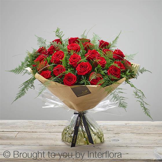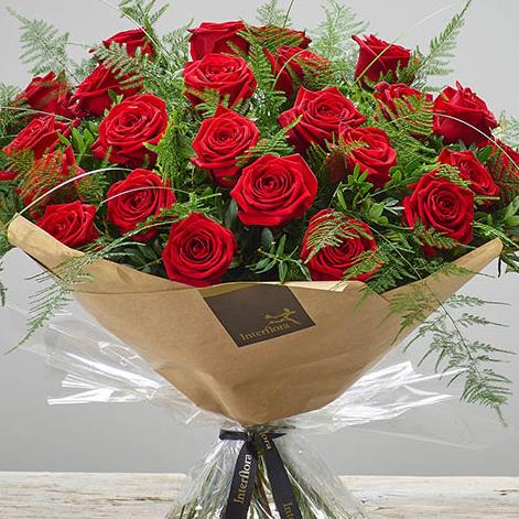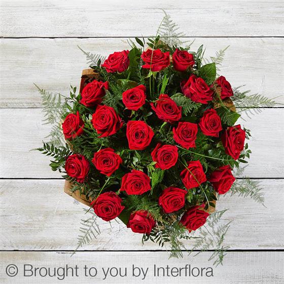 Featuring 24 large headed red roses hand-tied with asparagus fern, bear grass and pistache, and presented in Gift Packaging.