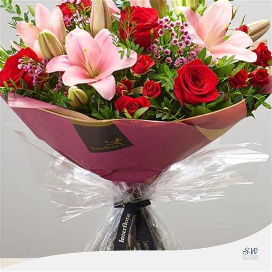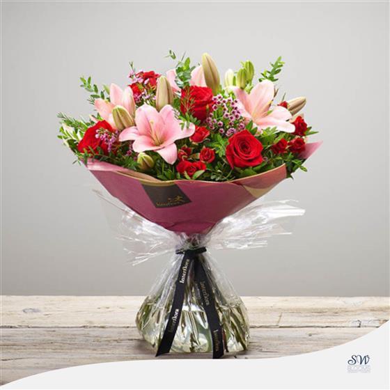 Introducing our Strawberry Sweetheart Hand-Tied, a harmonious blend of romantic blooms expertly crafted by our skilled florists. This exquisite arrangement features Red Large-Headed Roses, Pink LA Lilies, Red Spray Roses, and Pink Waxflower, elegantly hand-tied with accents of Salal, Pistache and Eucalyptus. Wrapped and presented in gift packaging, this bouquet is a beautiful expression of love and admiration.