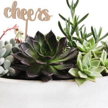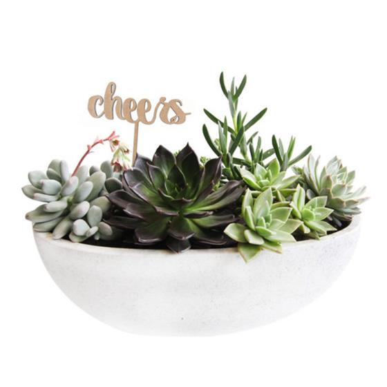 This arrangement consists of mixed succulents arranged nicely in a white bowl, a perfect gift for any occasion that comes with a 'Cheers' plaque or card attached. Succulents need bright filtered light to full light to thrive, and only water when soil is dry, once a week should do.