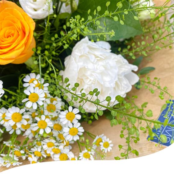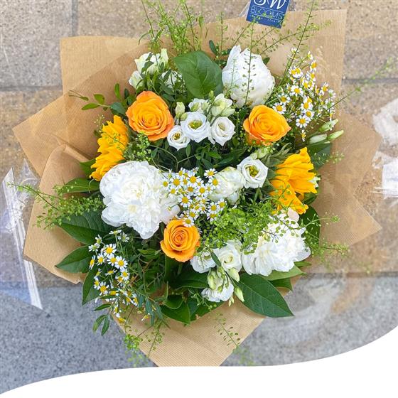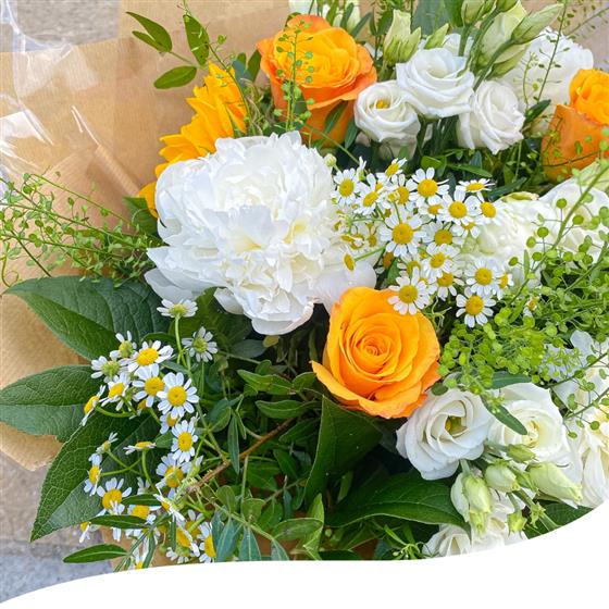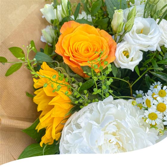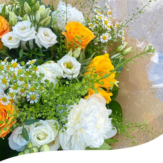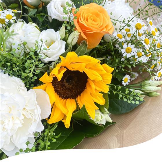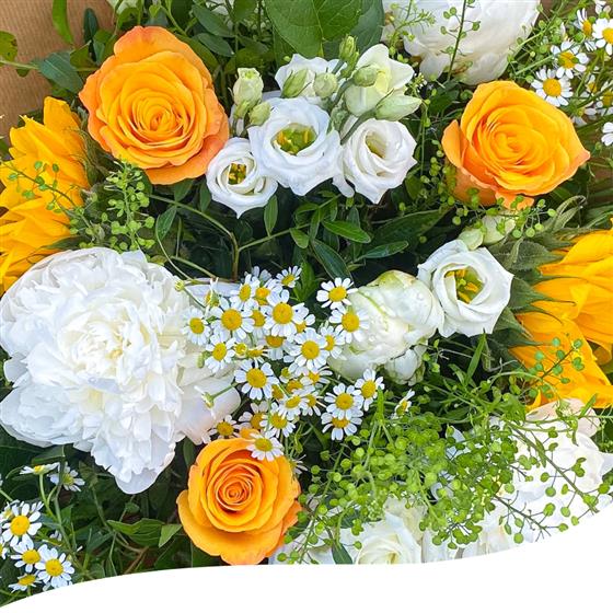 Brighten someone's day with our exquisite Summer Bliss With Peonies. This stunning arrangement features a harmonious blend of vibrant Yellow Roses, delicate White Peonies, charming Daisy-Like blooms and sunflowers. all nestled amidst lush greenery. Perfect for any occasion, this bouquet embodies joy and elegance, making it a delightful gift for birthdays, anniversaries or simply to say "I'm thinking of you."