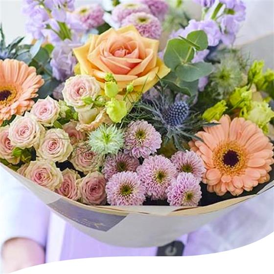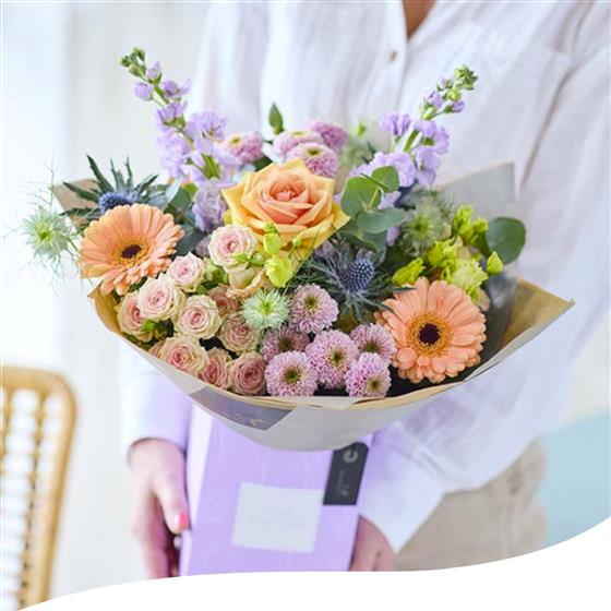 Experience the beauty of the large version of our Summer Classic Bouquet. This exquisite hand-tied arrangement features delicate colours reminiscent of summer twilight, with soft pinks, peaches, creams, lilacs, lemon, and light blues blending to create a tranquil display that evokes the calming hues of dusk.
